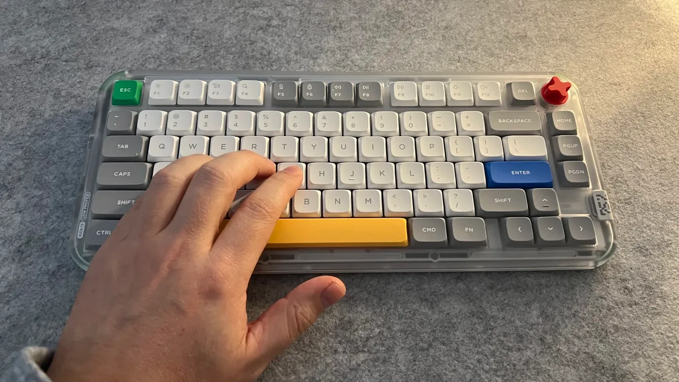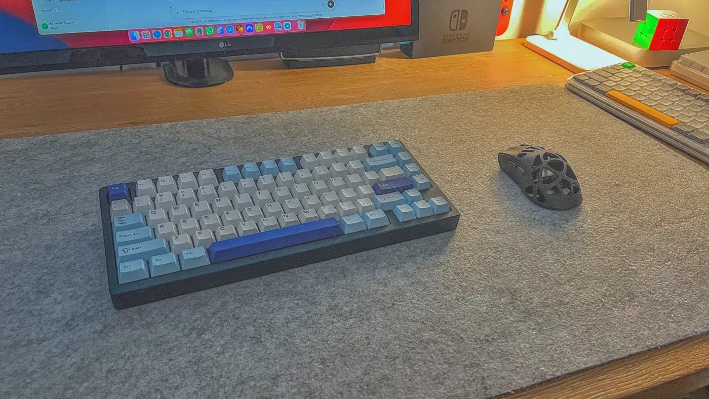 Dopo qualche minuto mi sono accorto che stavo scrivendo in modo diverso, non più attento al suono dei tasti, ma a quanto tempo passava tra una parola e l’altra. Il silenzio rendeva la scrittura più continua, non c’erano picchi, non c’erano interruzioni nette. Questa tastiera è configurata per smorzare quasi tutto: lo switch è silent, la struttura assorbe bene le vibrazioni e il colpo finale del tasto non rimbalza sul tavolo, ma quello che non c’è un tasto che emerge sugli altri, non c’è una lettera che “buca” il silenzio.
