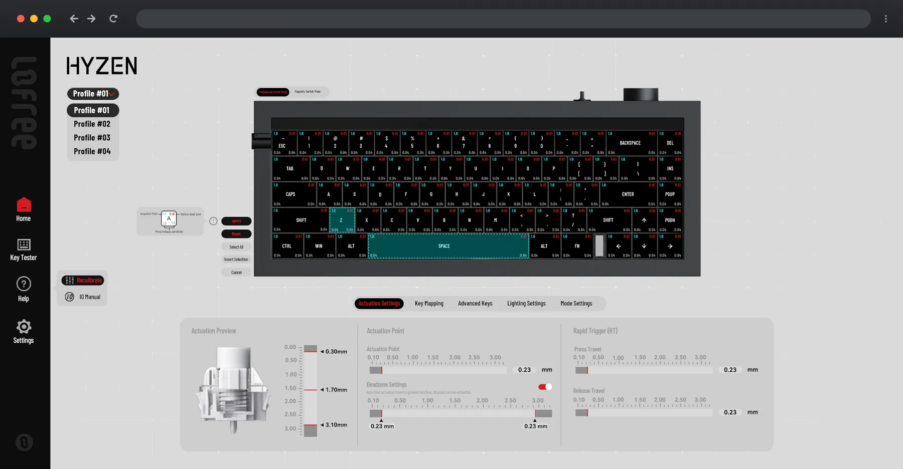 Sul fronte software, Lofree accompagna Hyzen con Lofree Hub, la piattaforma pensata per gestire in modo avanzato tutte le funzioni della tastiera. Qui l’utente può intervenire con precisione su parametri come la sensibilità del Rapid Trigger, oltre a configurare impostazioni più evolute come DKS (Dynamic Keystrokes) e SOCD, così da adattare il comportamento della tastiera alle proprie esigenze e ottenere un controllo ancora più raffinato, soprattutto in ambito gaming competitivo.