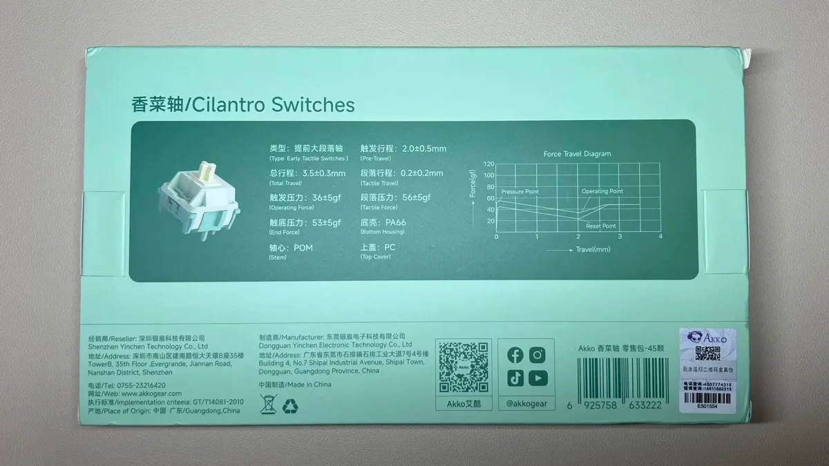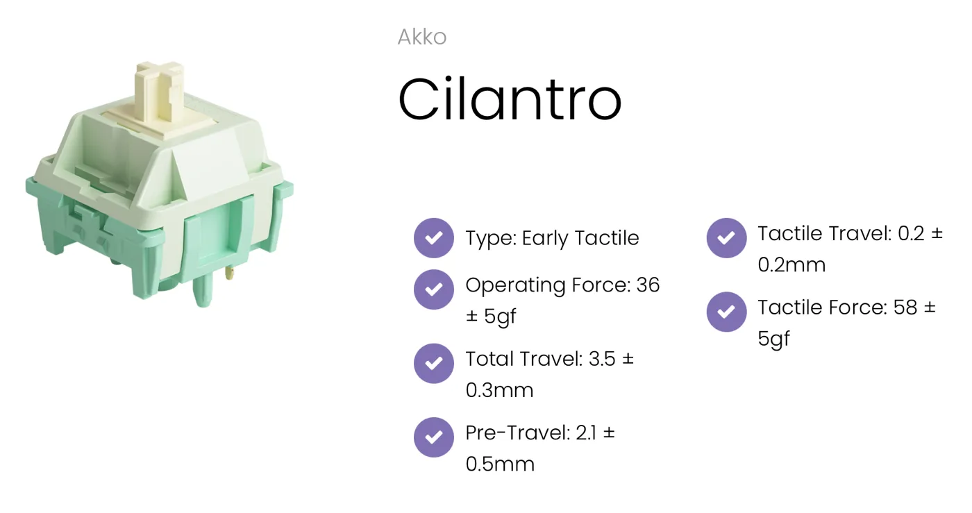 Con un nome ispirato al coriandolo, pianta dal sapore intenso e divisivo, questi switch puntano chiaramente a lasciare un’impressione forte: o li si ama, o li si evita. Akko descrive i Cilantro come una combinazione di fluidità e resistenza, con una risposta tattile pensata per gli utenti che desiderano un feeling solido e una maggiore presenza sotto le dita, pur mantenendo una corsa fluida e ben lubrificata.