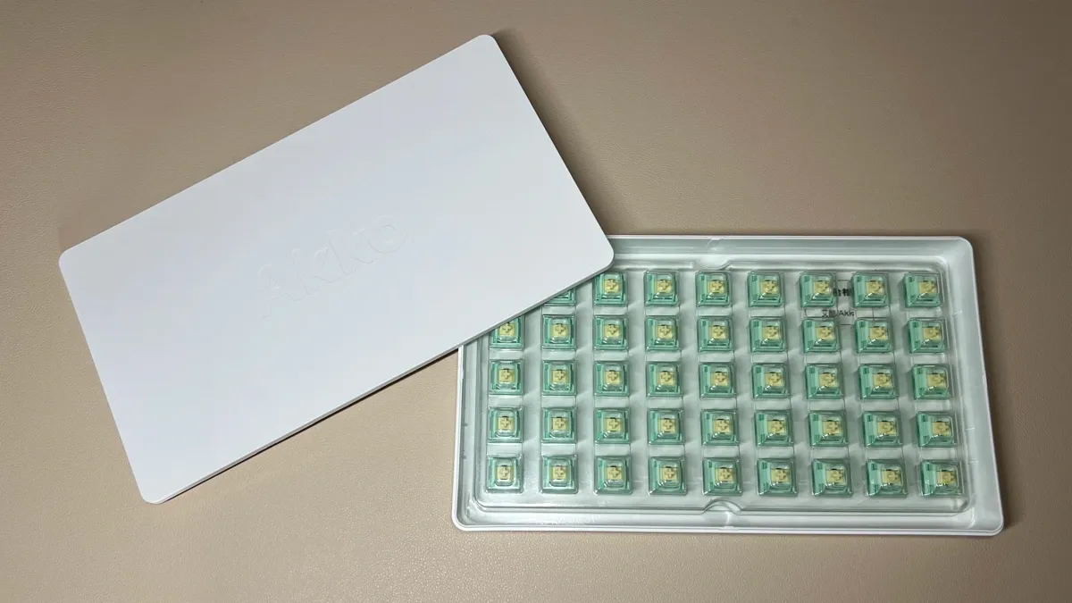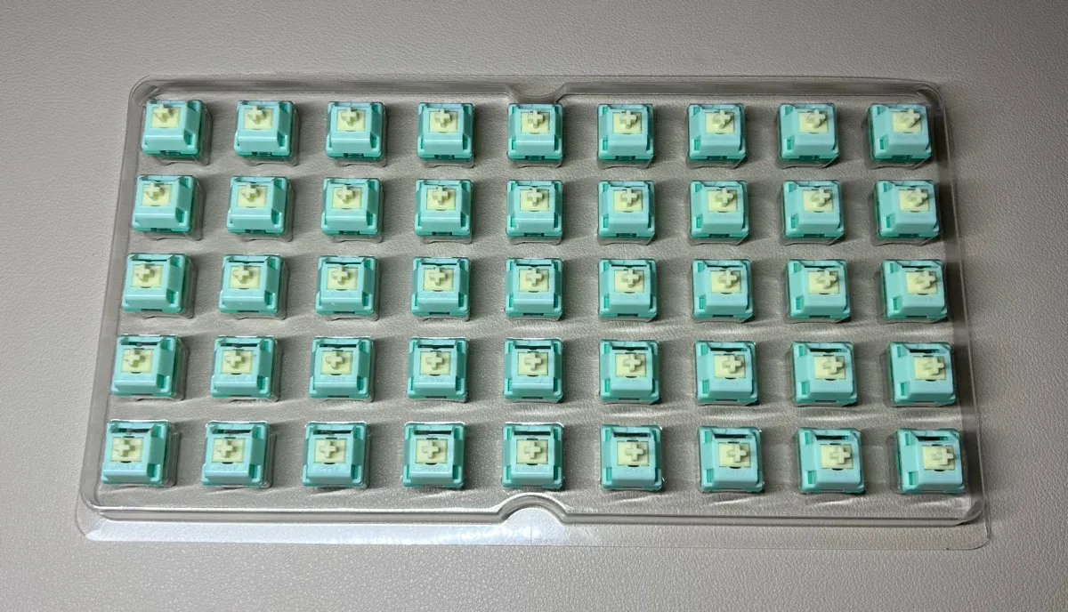 Sollevando il coperchio, appare il blister trasparente con i 45 switch disposti in modo ordinato, con il loro verde coriandolo: una tonalità fresca e decisa che anticipa perfettamente il carattere di questi switch.