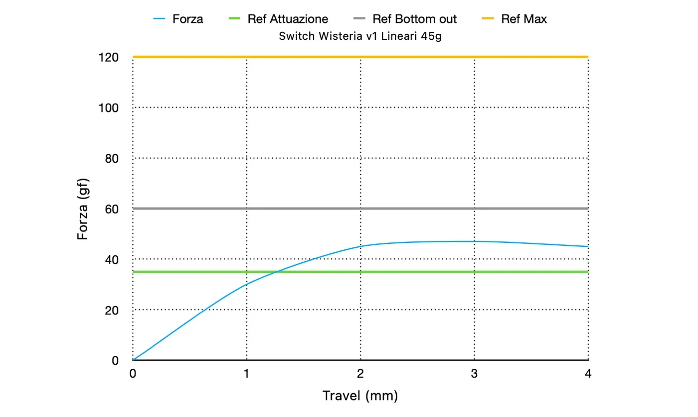 Con una forza di attuazione di 45 gf, un pre-travel di 2,0 mm e una corsa totale di 3,6 mm, offrono una risposta leggera e scorrevole, ideale per una digitazione veloce e prolungata. Non sono pensati per chi cerca un feedback marcato o una risposta particolarmente decisa, ma trovano un buon equilibrio tra leggerezza e controllo, risultando adatti a chi predilige una scrittura fluida senza sensazioni troppo cedevoli.