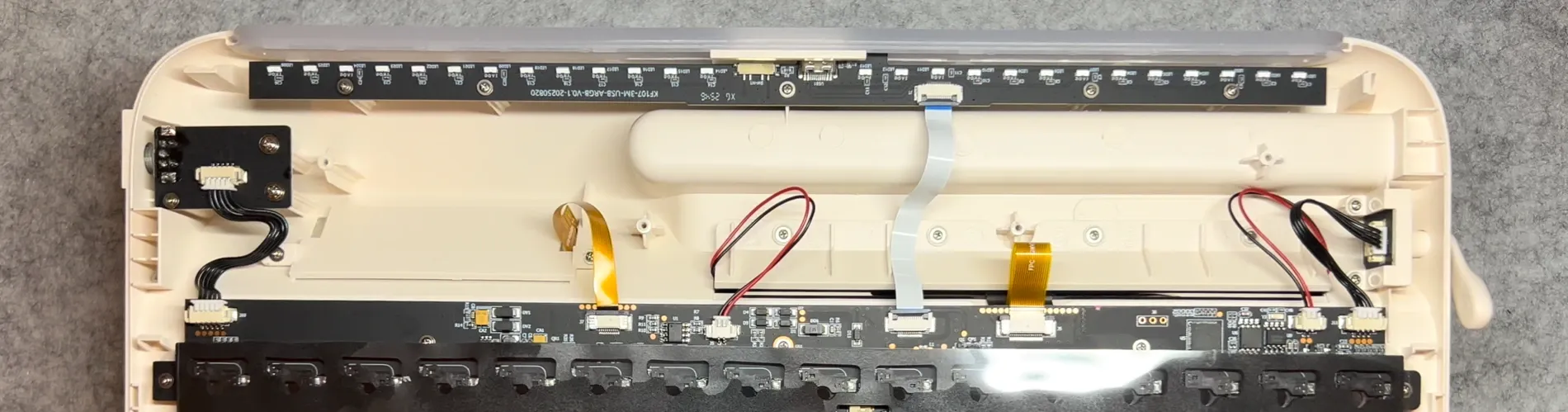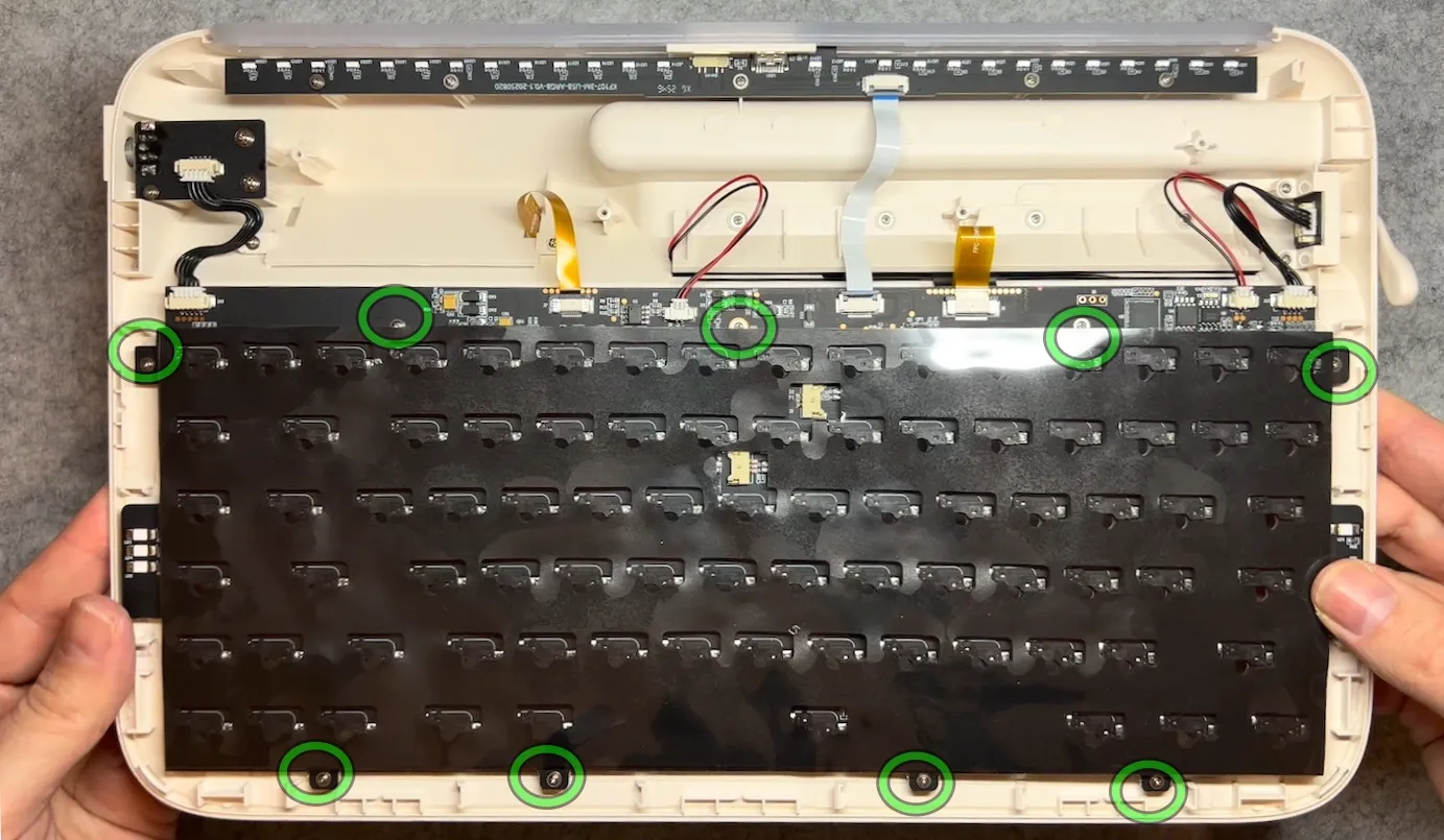 Superato lo scoglio dell’accesso all’interno della tastiera, che rimane l’aspetto più discutibile del teardown, è difficile non notare la complessità progettuale che si nasconde sotto la scocca della Epomaker Glyph. È vero che non siamo davanti a una struttura gasket, e che PCB e plate sono avvitati direttamente al top case, ma questa scelta appare molto più comprensibile se si osserva attentamente tutto ciò che converge sulla scheda principale. Il PCB non gestisce soltanto switch e retroilluminazione, ma concentra una quantità importante di componenti e connessioni: i due display, la leva in stile macchina da scrivere, la manopola, la striscia LED, gli indicatori di statointegrati nel case, oltre alla gestione delle due batterie e delle diverse modalità di connessione. In un contesto di questo tipo, la scelta di una struttura più rigida e tradizionale diventa comprensibile, se non addirittura necessaria, per garantire stabilità e affidabilità nel funzionamento complessivo.