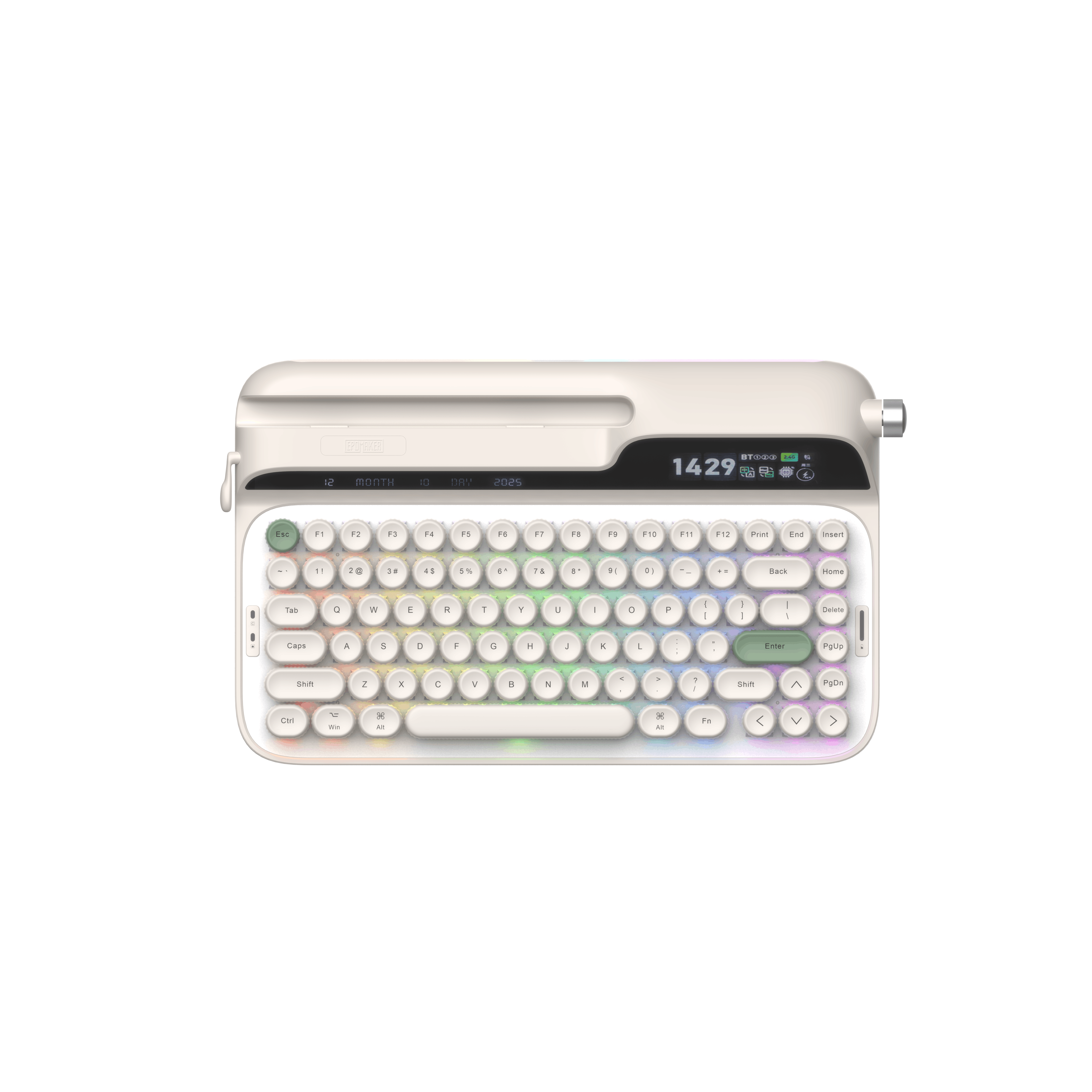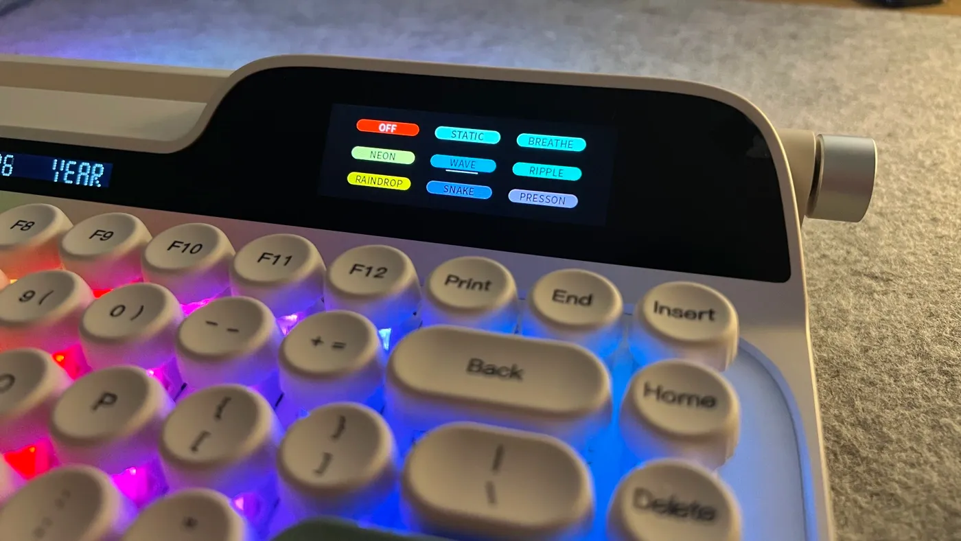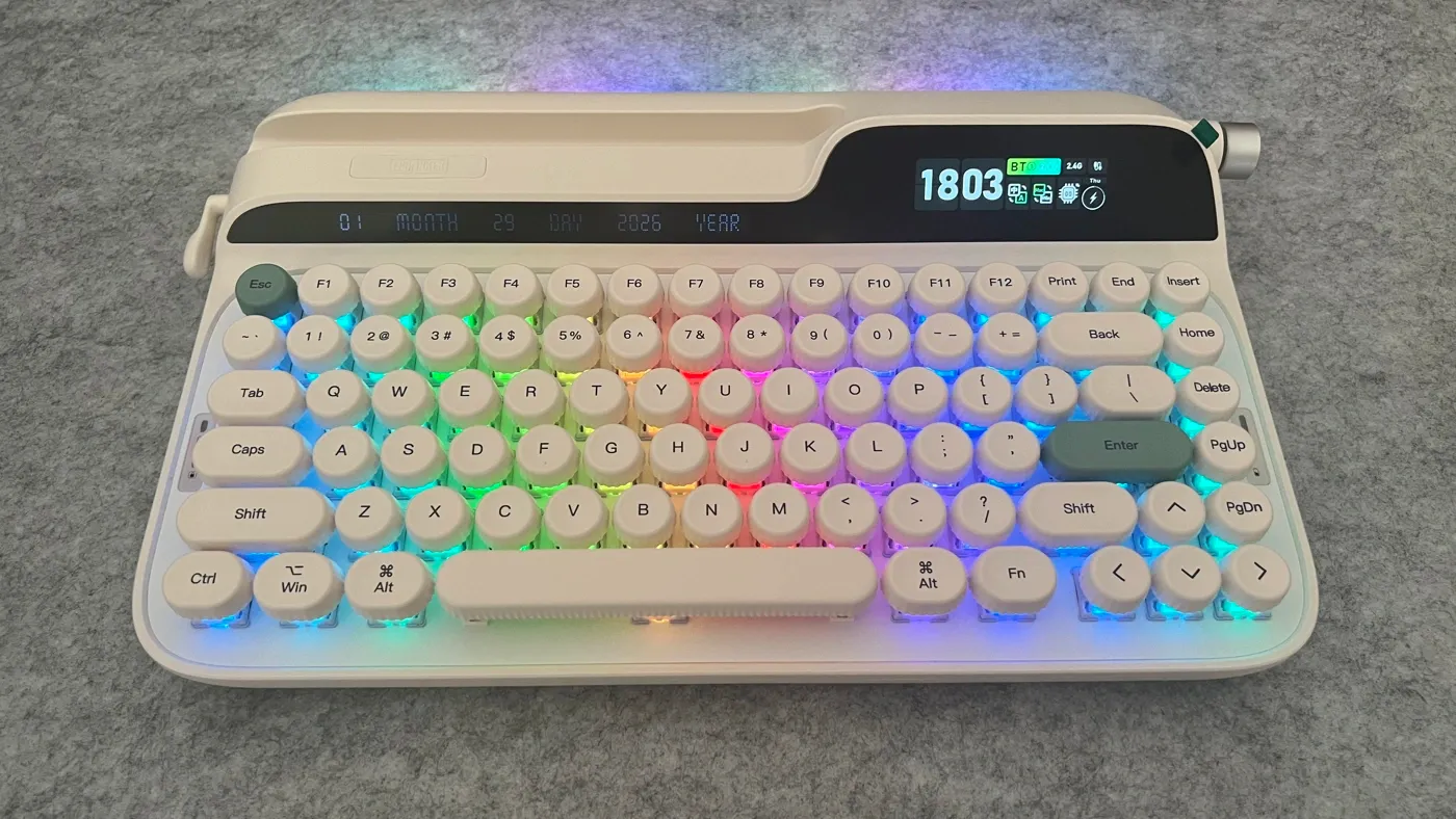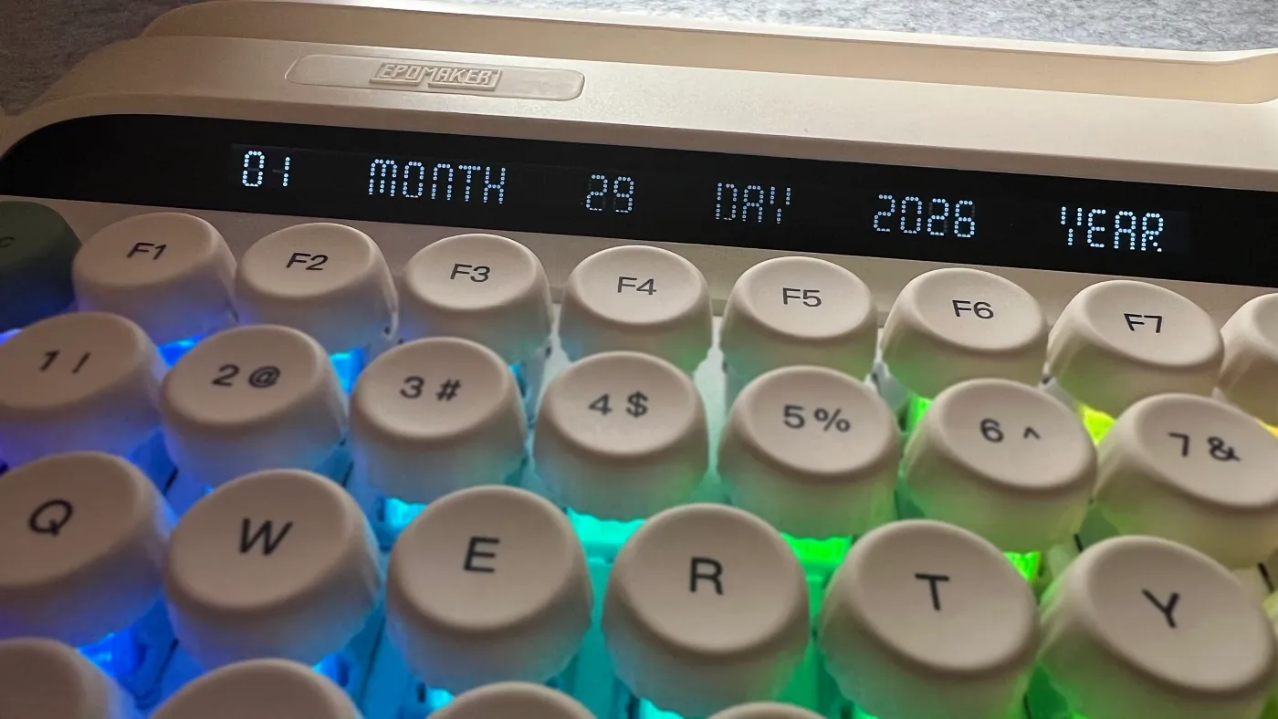 Il richiamo alle macchine da scrivere è evidente e va ben oltre la semplice scelta estetica dei keycaps, estendendosi all’introduzione di una leva meccanica che prova a reinterpretare in chiave moderna un gesto ormai appartenente al passato, ma ancora fortemente evocativo. A questa componente si affiancano un display integrato e una manopola fisica, soluzioni che spostano l’attenzione dalla sola digitazione a un’interazione più ampia con il proprio setup, suggerendo l’idea di una tastiera che vuole fare qualcosa in più. Con la Glyph, Epomaker sembra voler sperimentare in modo più deciso, mescolando un’estetica dichiaratamente rétro puntando su un’esperienza d’uso pensata per chi cerca una tastiera capace di caratterizzare la propria postazione e di offrire un’interazione più “fisica” e consapevole.