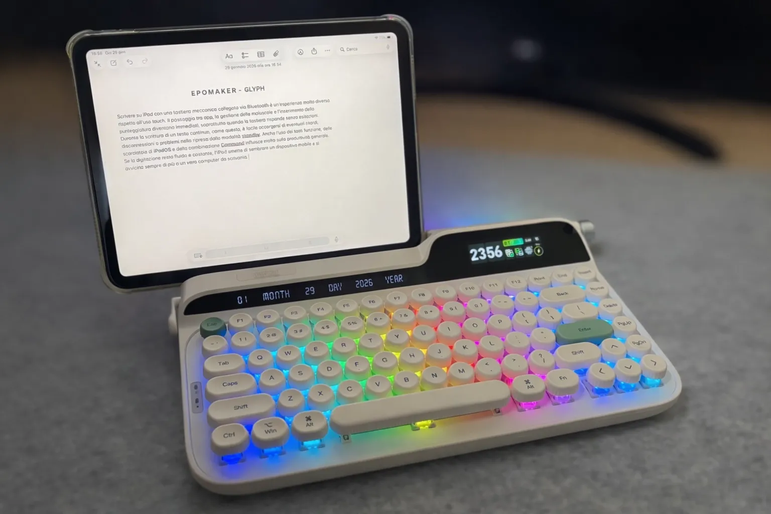 Un aspetto che incide ulteriormente sull’ergonomia della Epomaker Glyph è la presenza dello slot superiore, pensato per ospitare uno smartphone o un tablet e ampliare il modo in cui la tastiera può essere utilizzata all’interno di una postazione di lavoro. Ho testato la tastiera utilizzandola con un iPad inserito direttamente nello slot, trasformando di fatto la Glyph in una piccola postazione di scrittura compatta, nella quale schermo e tastiera risultano perfettamente allineati sullo stesso asse visivo. Si tratta di una soluzione che funziona bene sia dal punto di vista pratico sia da quello estetico, ma che rende evidente la necessità di prestare particolare attenzione alla postura e al supporto dei polsi, soprattutto durante sessioni di scrittura prolungate.