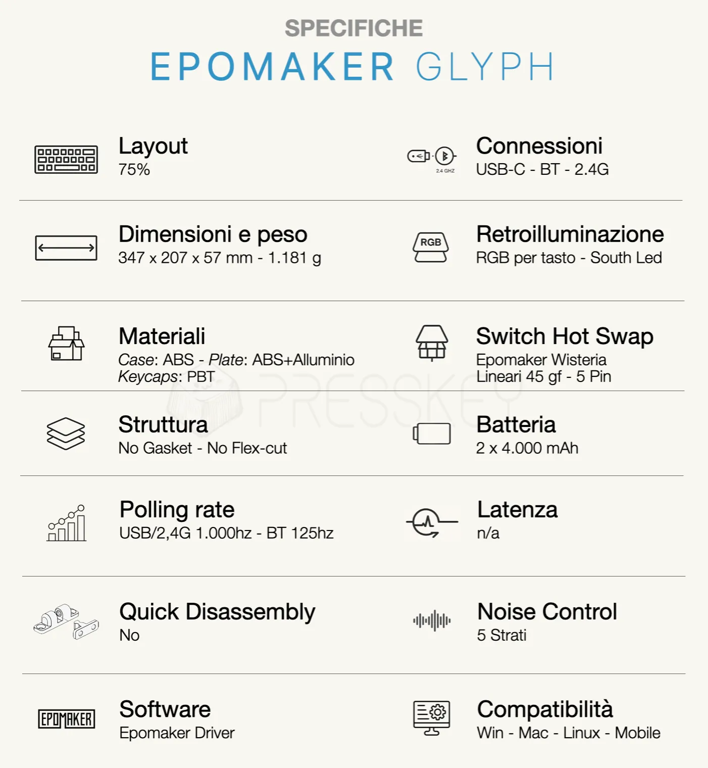 Prima di entrare nel merito dell’esperienza d’uso, può essere utile soffermarsi per un momento sulle specifiche tecniche della Epomaker Glyph, per avere un riferimento chiaro di ciò che la tastiera propone sulla carta e per inquadrare meglio alcune scelte progettuali. Di seguito trovi un riepilogo delle caratteristiche principali, raccolte in forma schematica così da poterle consultare rapidamente, prima di passare all’analisi più approfondita.
