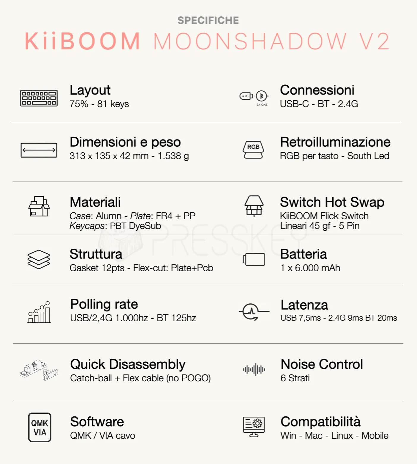 Prima di approfondire nel dettaglio ogni singolo aspetto della tastiera, credo sia utile fare un passo indietro e dare uno sguardo d’insieme alle sue caratteristiche tecniche, concentrandoci su quelle che considero le specifiche più rilevanti per capire davvero che tipo di prodotto abbiamo davanti. Per rendere la consultazione più semplice e immediata ho raccolto tutte le informazioni essenziali in un’infografica riassuntiva, così da avere un quadro chiaro e ordinato prima di passare all’analisi approfondita.