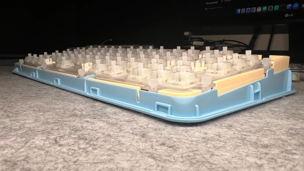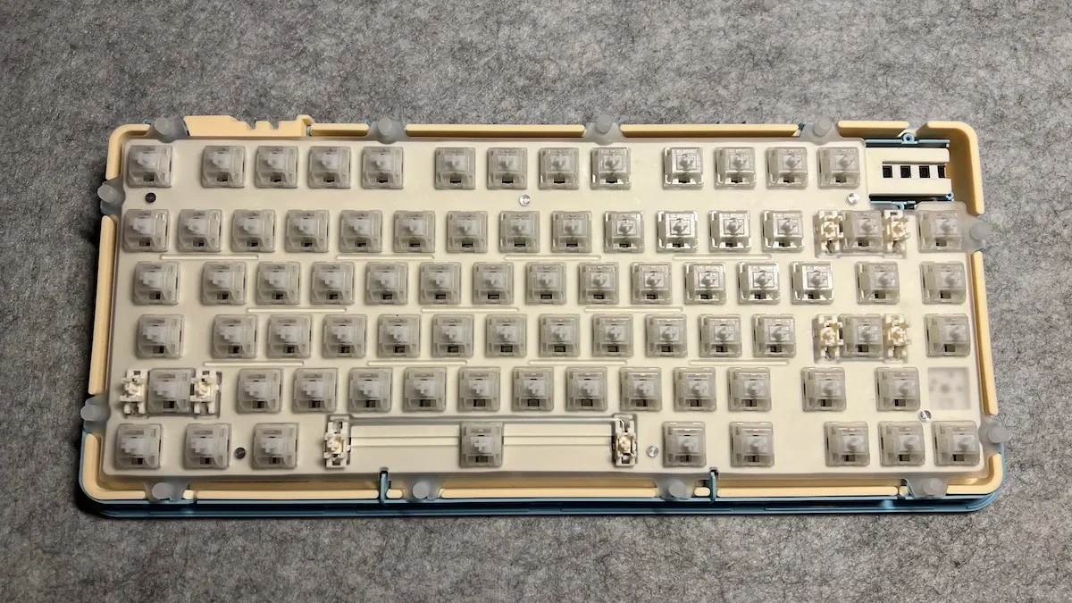 La tastiera utilizza un sistema piuttosto particolare, all’interno del case inferiore sono presenti molle inserite in appositi slot, sulle quali poggiano i gasket in silicone. Questi gasket, dalla caratteristica forma “a manubrio”, sono agganciati direttamente al plate, creando un punto di contatto elastico tra la struttura interna e il corpo della tastiera.