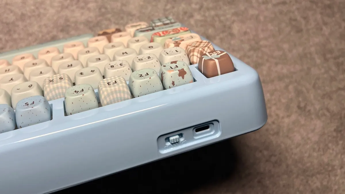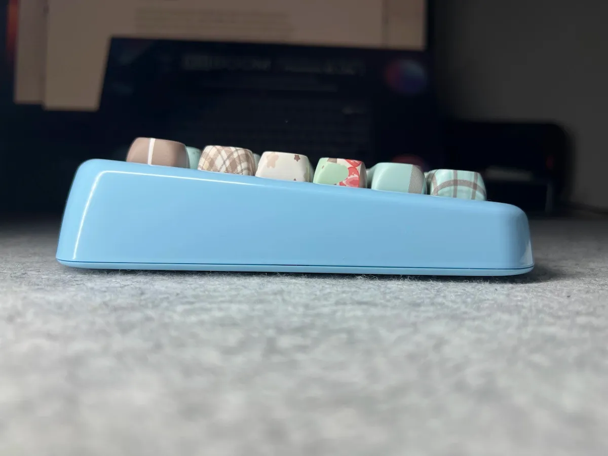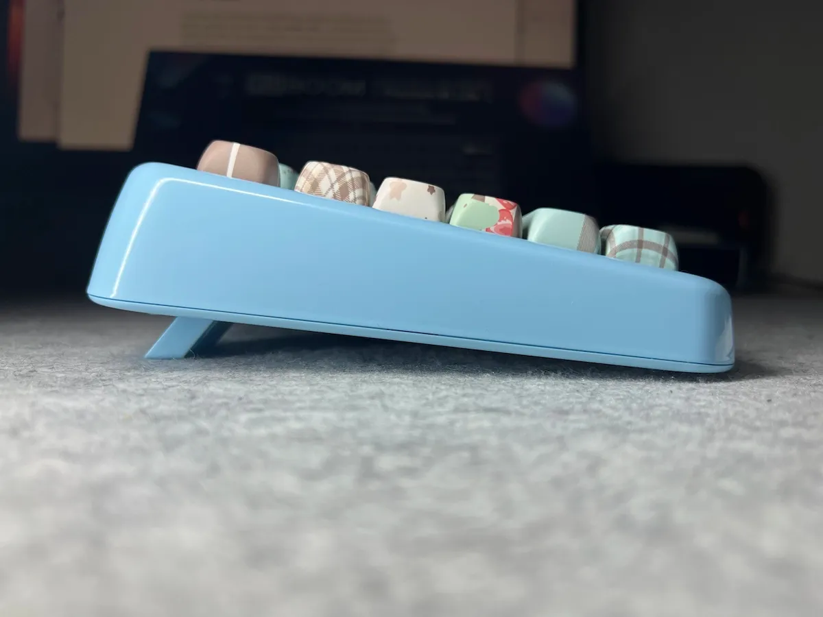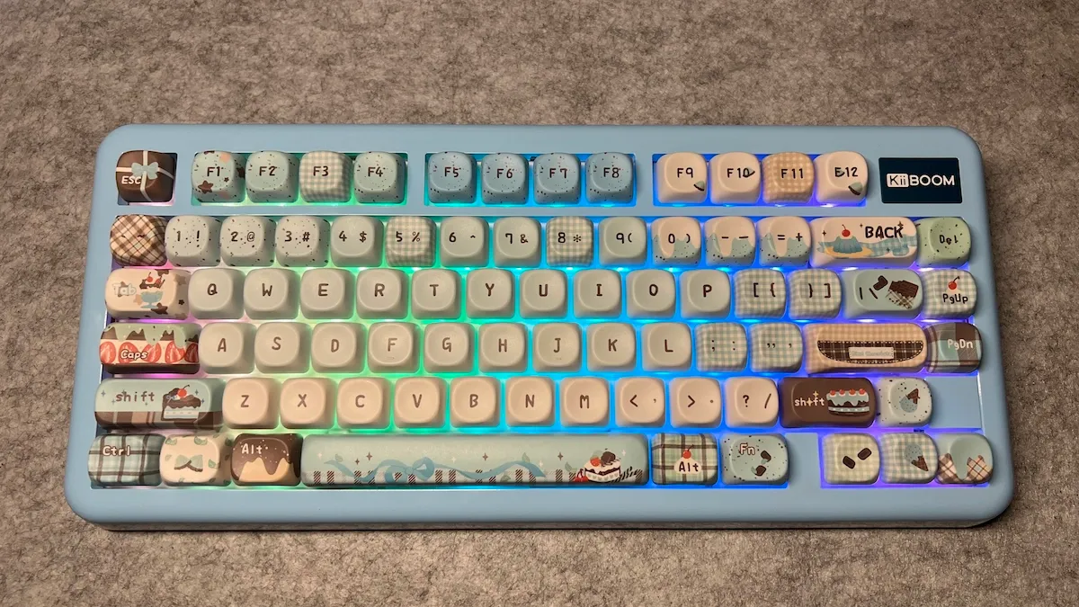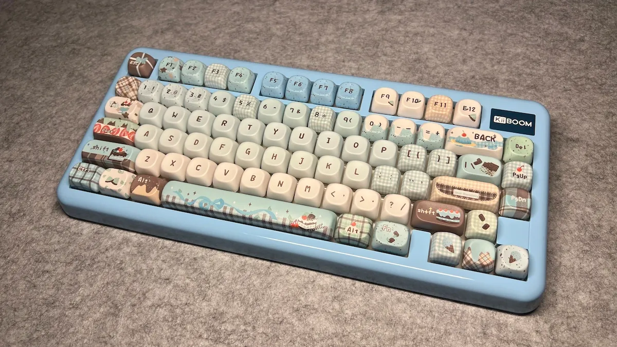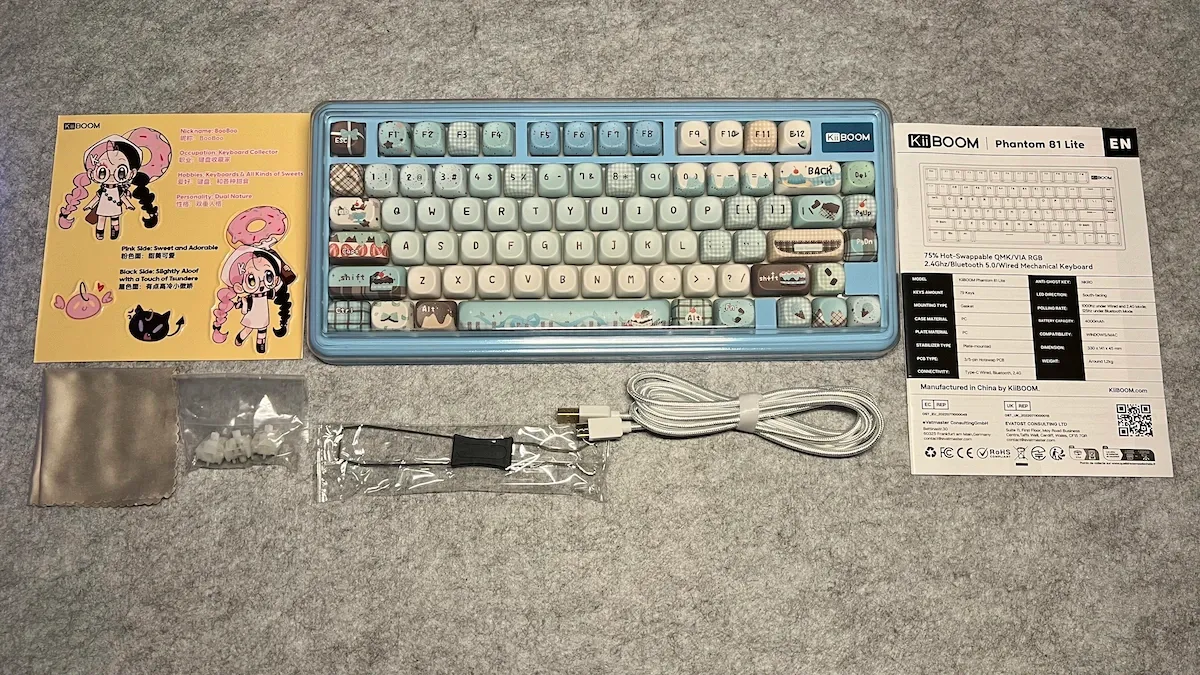 Il design della KiiBoom Phantom 81 Lite punta tutto su uno stile giocoso e fortemente caratterizzato, che la rende immediatamente riconoscibile sulla scrivania. Colori, illustrazioni e keycaps raccontano chiaramente un’identità precisa, pensata per chi ama una postazione personale e fuori dagli schemi. La scocca è realizzata in plastica, con una finitura lucida che restituisce una buona sensazione al tatto e non trattiene eccessivamente impronte o polvere. Il colore celeste del case fa da base, valorizza ulteriormente il set di keycaps incluso, vero protagonista dal punto di vista estetico.