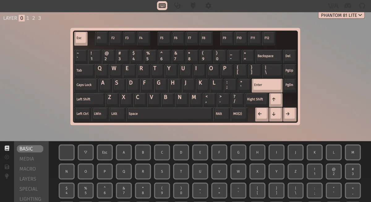 La Phantom 81 Lite non utilizza un software proprietario tradizionale, ma è compatibile con QMK e VIA, una scelta che strizza l’occhio agli utenti più esperti e a chi apprezza un approccio aperto e flessibile alla personalizzazione. KiiBoom fornisce direttamente il file JSON necessario per VIA, permettendo di configurare la tastiera senza installare applicazioni dedicate. Attraverso VIA è possibile rimappare i tasti, creare layer personalizzati e gestire diverse configurazioni in modo semplice e immediato, direttamente dal browser o dall’app VIA, con modifiche applicate in tempo reale.