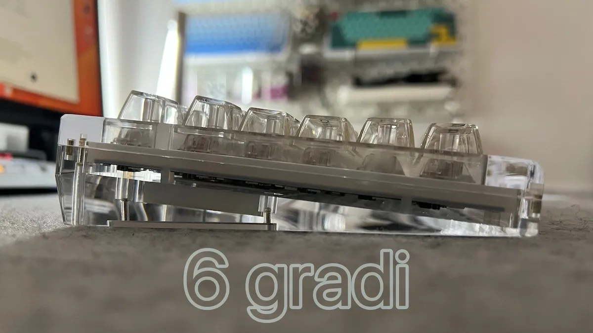 Una soluzione che però non mi ha convinto del tutto è l’illuminazione laterale, personalmente avrei preferito una diffusione più morbida, che sfumasse la luce evitando di far percepire i singoli punti LED. Su una tastiera completamente trasparente l’effetto sarebbe stato ancora più d’impatto e, per questo motivo, tendo a non utilizzare spesso gli effetti dedicati ai sidelight. È comunque una considerazione soggettiva — e lo ribadisco — perché dalle foto e dal video potete farvi un’idea precisa e capire se questo tipo di resa luminosa incontra o meno i vostri gusti. Resta il fatto che, quando attiva, l’illuminazione laterale aggiunge un ulteriore livello di personalizzazione e, vista di lato, crea un effetto quasi tridimensionale che fa sembrare la tastiera sospesa sulla scrivania.