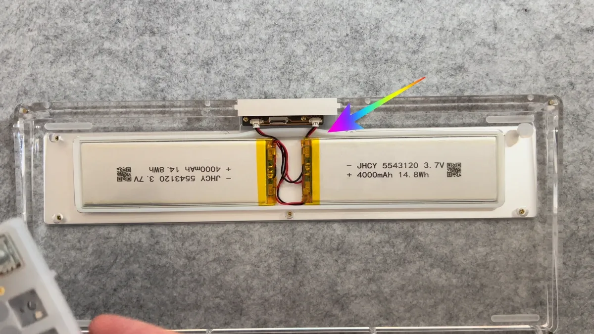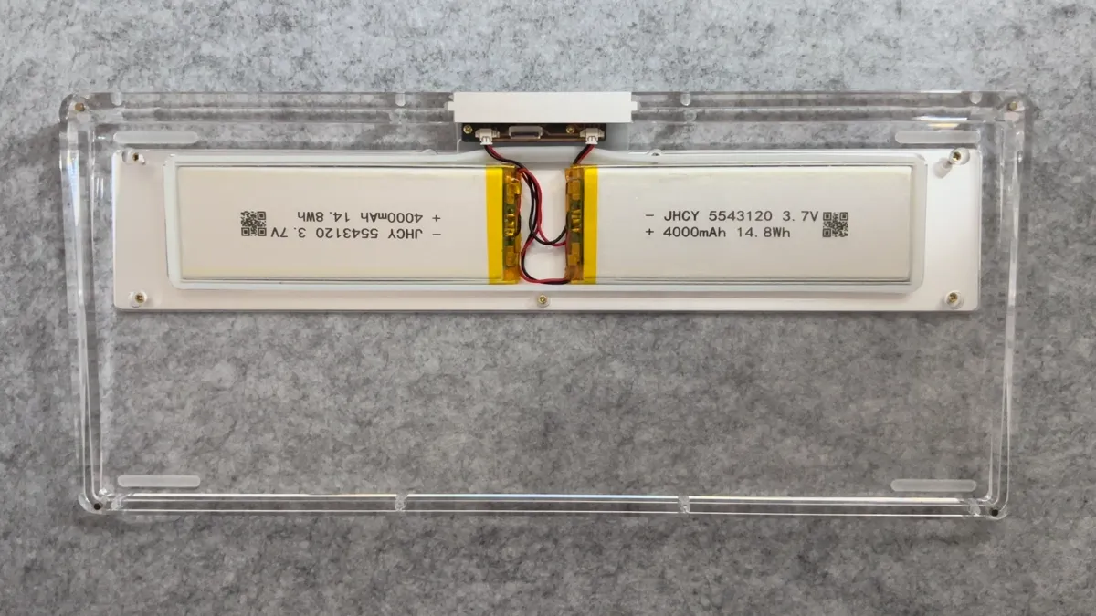 La tastiera integra due batterie da 4.000mAh ciascuna, per un totale di 8.000mAh 😱 il doppio rispetto alle revisioni precedenti. Una scelta introdotta da Kiiboom per rispondere chiaramente ai problemi di autonomia segnalati dagli utenti nelle versioni precedenti, soprattutto quando si utilizzava l’RGB, elemento che, su una tastiera completamente trasparente come questa, incide inevitabilmente sui consumi.