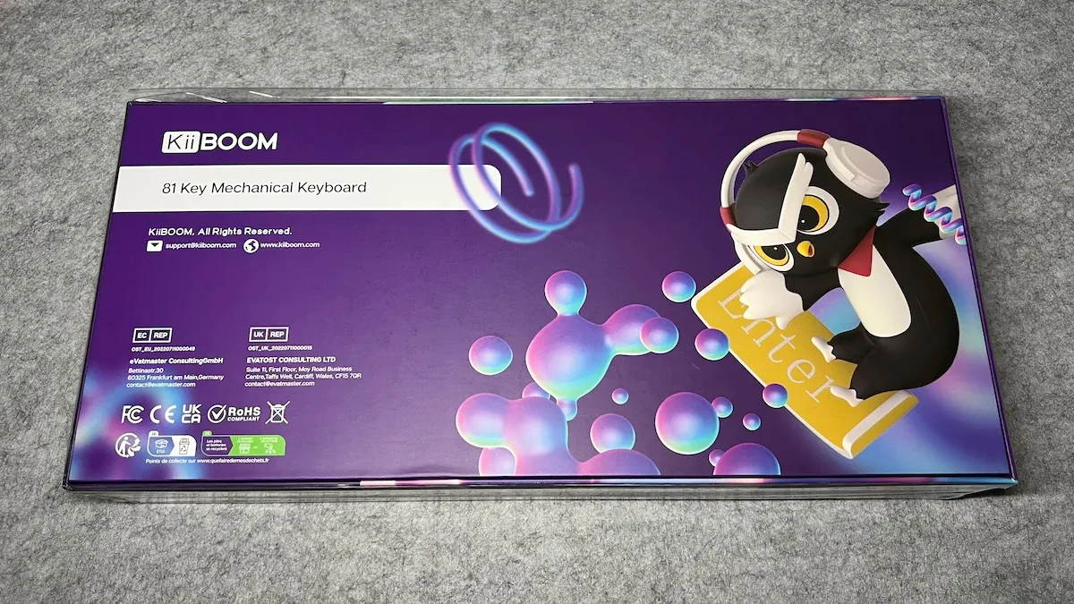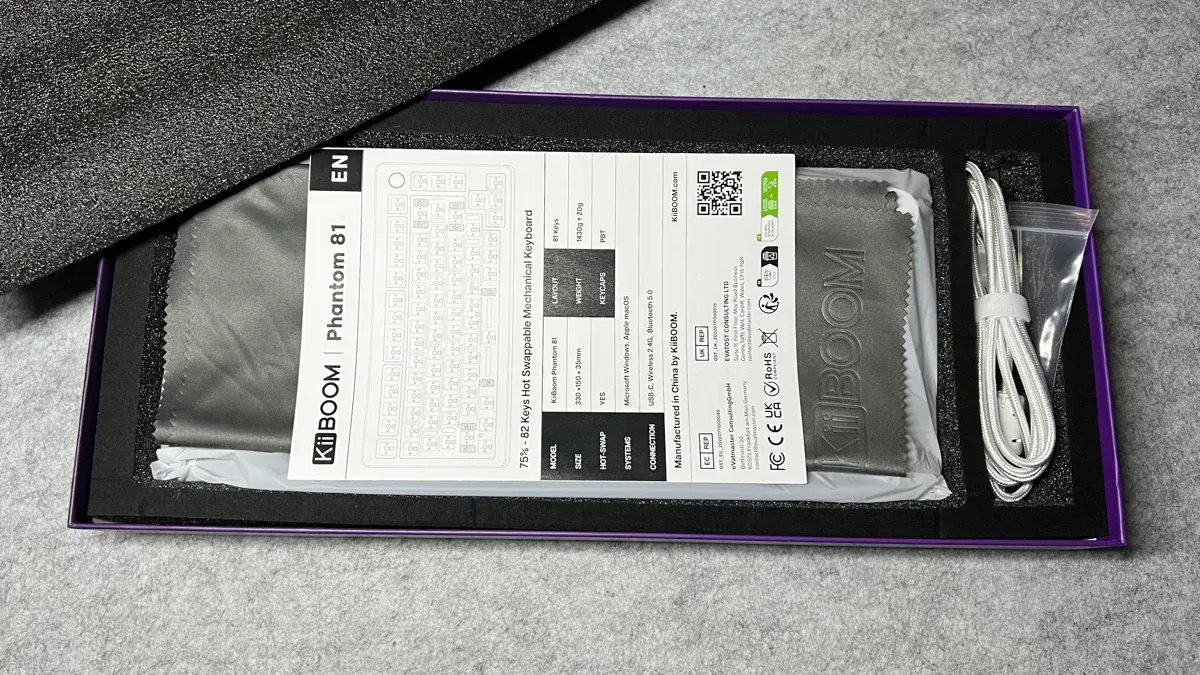 Fatta eccezione per il peso importante dovuto al contenuto, il packaging della Phantom 81 rientra pienamente negli standard della categoria, con una confezione solida, ben stampata e caratterizzata dalla grafica tipica di Kiiboom. All’interno la tastiera è alloggiata in una sagoma in materiale espanso, modellato esattamente sulle sue forme, così da proteggerla in modo efficace durante il trasporto. Sollevato il coperchio e rimosso il primo strato di protezione, troviamo il manuale utente, stampato in doppia lingua (inglese e cinese). Molto gradita la presenza del panno per la pulizia, con il logo Kiiboom serigrafato, un dettaglio semplice ma sempre utile.