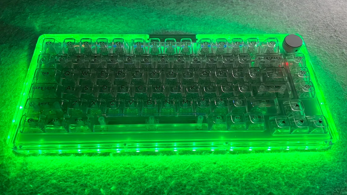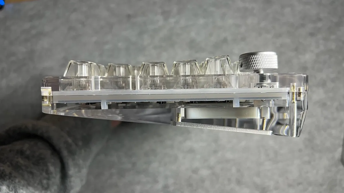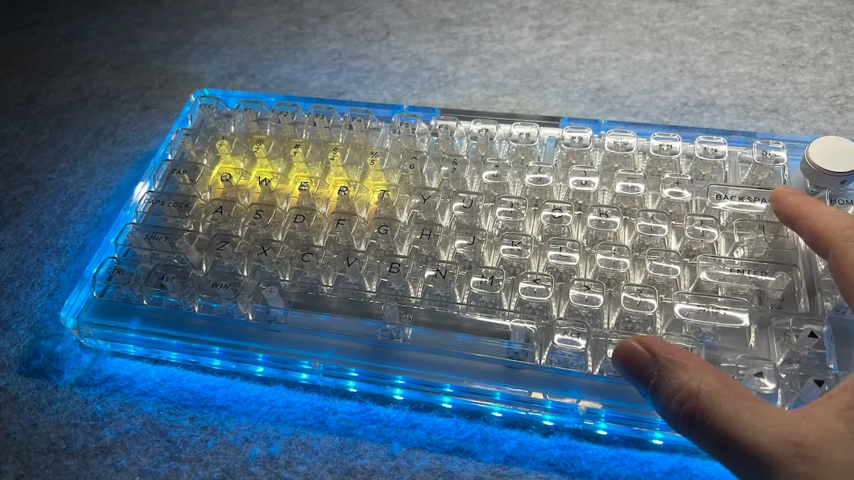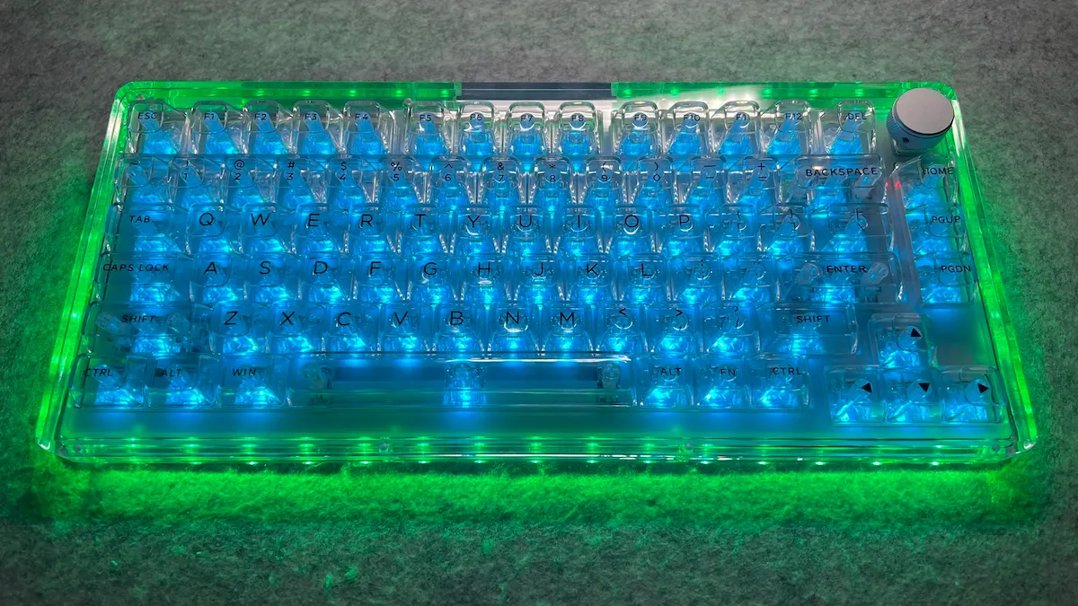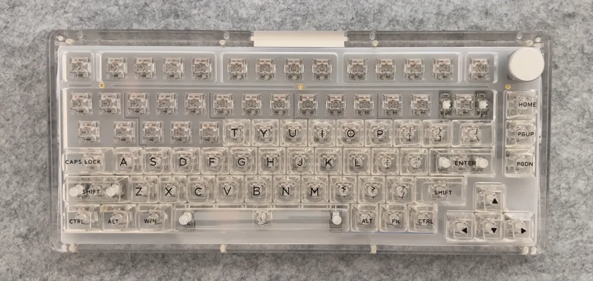 Questa tastiera si distingue per la scocca interamente trasparente, realizzata con una cura e una solidità difficili da trovare in prodotti simili. Il layout 75% è completo e funzionale, con una manopola in alluminio ben integrata, mentre la struttura interna — plate in PC con flex-cut, silicone e gasket — offre una digitazione morbida, controllata e con un profilo sonoro piacevole.
