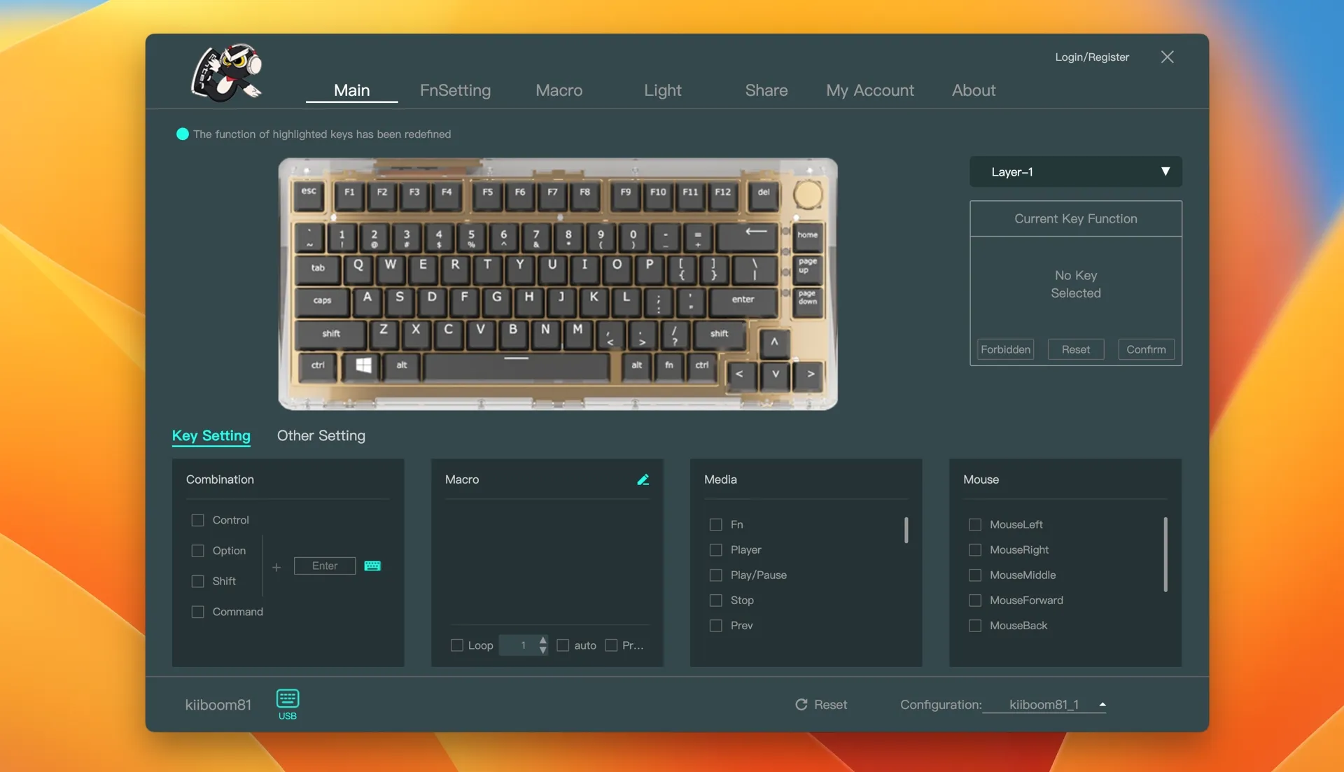Il software Kiiboom, disponibile per Windows e macOS, permette di gestire in modo semplice tutti gli aspetti della Phantom 81. Non è compatibile con VIA/QMK, ma l’interfaccia è chiara e divisa in sezioni intuitive: dalla rimappatura dei tasti ai layer Fn, passando per macro e funzioni multimediali, tutto è facilmente configurabile.