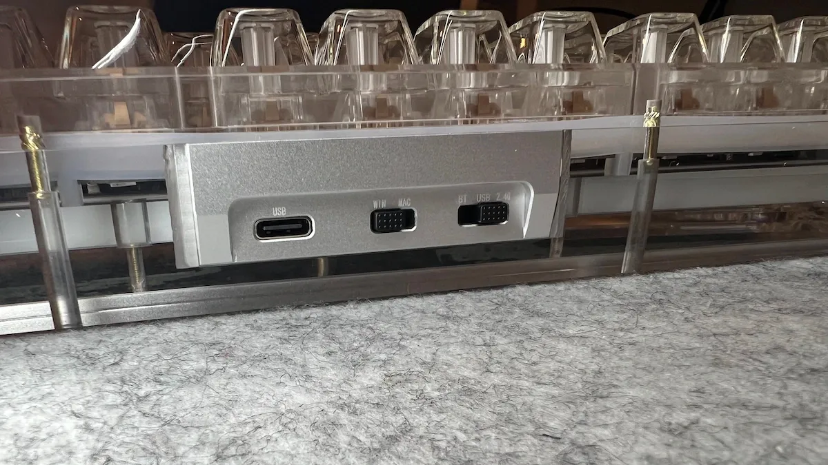 Sul retro, posizionata al centro, troviamo una placca in alluminio che ospita la porta USB-C e i due switch dedicati: uno per selezionare la modalità di connessione e l’altro per scegliere il layout tra Windows e macOS. È un dettaglio che spicca subito grazie al contrasto tra il metallo e la trasparenza del corpo. La parte superiore mette subito in evidenza i keycaps completamente trasparenti in profilo OEM, che contribuiscono all’estetica clear della tastiera che permettono alla retroilluminazione RGB di diffondersi uniformemente su tutta la superficie mettendo in risalto la manopola del volume in alluminio con i suoi caratteristici bordi zigrinati. Capovolgendola, nella parte inferiore salta all’occhio il peso in alluminio con il logo Kiiboom inciso. Anche questo elemento è visibile attraverso l’acrilico e contribuisce sia alla stabilità della tastiera sia al colpo d’occhio generale, creando un gioco di riflessi molto piacevole quando l’RGB è attivo. Grazie al grado di trasparenza le luci LED si diffondono lungo tutta la struttura, creando un effetto tridimensionale che valorizza moltissimo la profondità dello chassis. Da ogni lato la tastiera mostra qualcosa: profili interni, giunzioni, illuminazione che rimbalza sulle superfici.. è un design che vive tanto frontalmente quanto lateralmente.