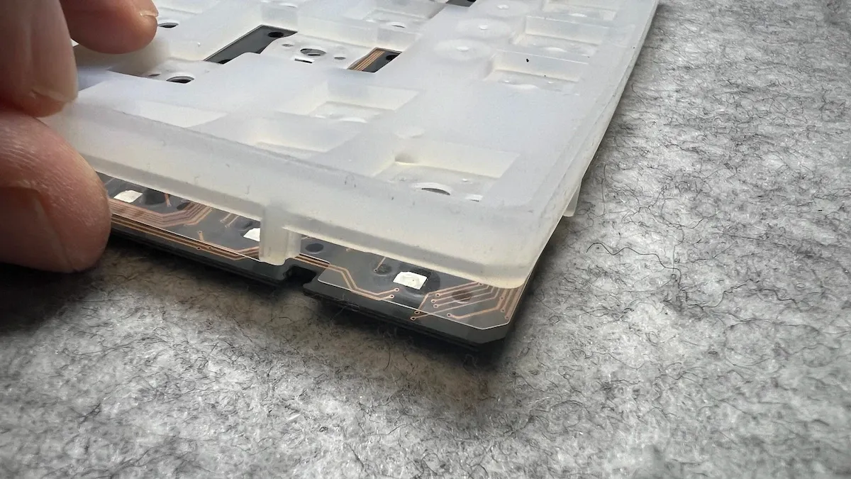 Per comprendere davvero la Phantom 81 è stato indispensabile passare al teardown: solo aprendo la tastiera si apprezza il lavoro svolto da Kiiboom in questa terza revisione del modello. E già dal primo sguardo interno si capisce che l’azienda non si è limitata a un restyling estetico: la struttura è stata ripensata in modo mirato per migliorare sensazioni di digitazione e solidità. Il plate adottato è in policarbonato (PC) con flex cut ben distribuiti, scelta che contribuisce a rendere la digitazione più morbida e reattiva. Il plate poggia sul PCB ed entrambi sono avvolti da un generoso strato di silicone che agisce sia come elemento ammortizzante sia come supporto.