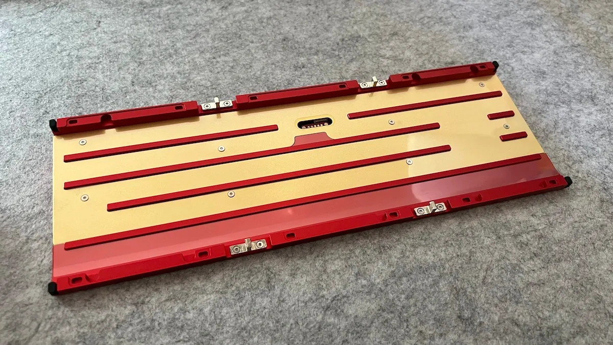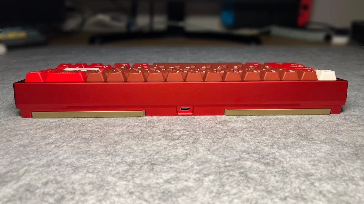 A prima vista, la Zen65 si presenta con un’estetica curata e compatta, tipica del formato 65%, con 67 tasti e una colonna laterale dedicata ai comandi di navigazione (Delete, End, Page Up e Page Down). Il case in alluminio CNC ha linee nette ma armoniose, e la finitura Red della versione in prova è molto più ricca dal vivo di quanto appaia in foto: un rosso opaco profondo, che cambia leggermente con la luce. Il fondo, invece, è molto più caratterizzato ed è impossibile non notarlo: la grande piastra dorata occupa quasi tutta la superficie e crea un contrasto – a mio parere – bellissimo con il rosso della scocca.