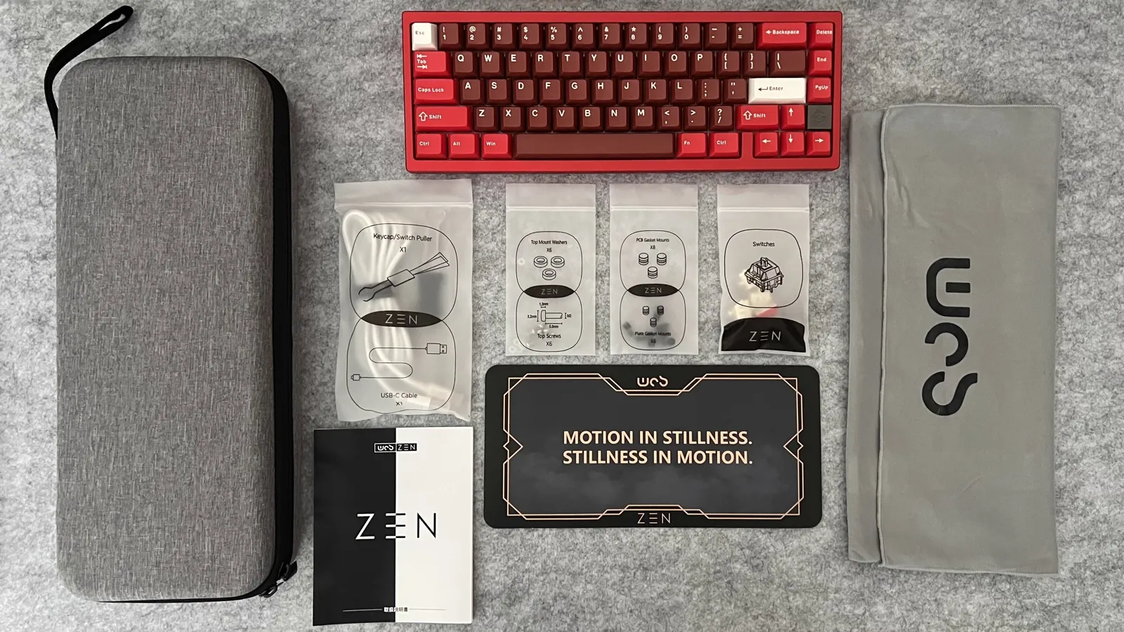Niente plate extra o strati fonoassorbenti aggiuntivi, come nel caso della Crush80, ma la Zen65 Ultra non sfigura affatto, il contenuto è ricco e studiato per dare all’utente una tastiera pronta all’uso, e una base perfetta per iniziare a moddare e personalizzare. Oltre alla tastiera, nel mio caso di un rosso stupendo, nella confezione troviamo: