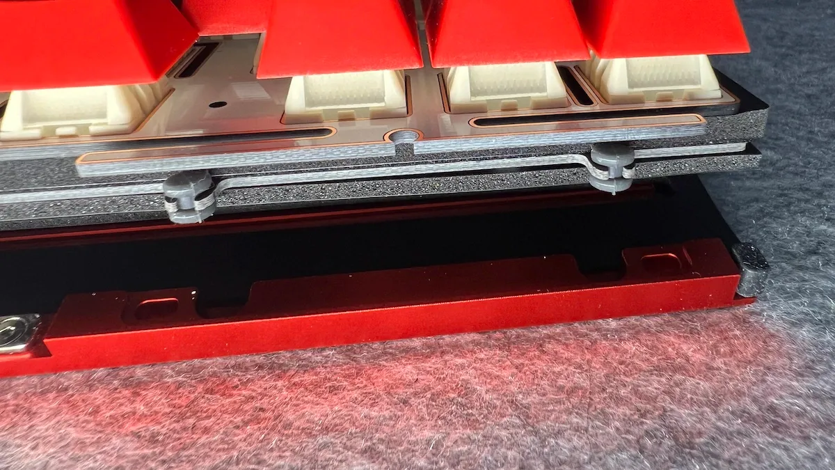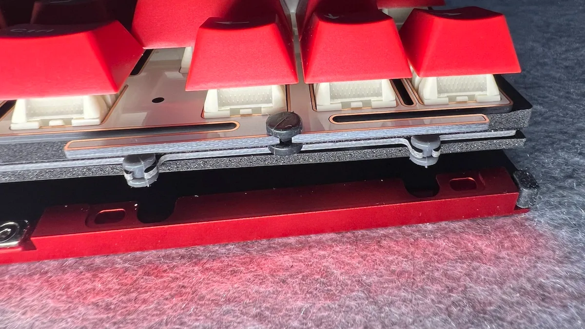 Dal punto di vista del montaggio, la Zen65 è una piccola palestra per chi ama sperimentare. La configurazione predefinita utilizza un gasket in silicone stile “sock”, una sorta di calza che avvolge le estremità delle alette del plate, sfruttando l’effetto “molla-balestra” . È un setup bilanciato, non troppo cedevole, scelto come punto di default.