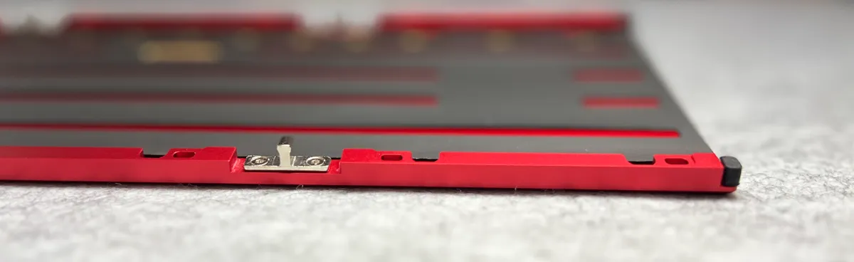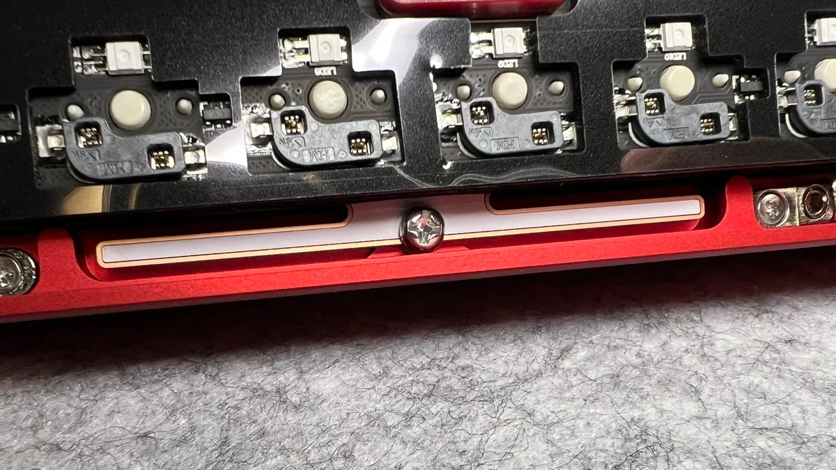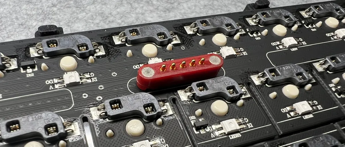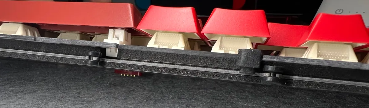 E qui arriva la parte interessante, una delle integrazioni più riuscite di questa tastiera è senza dubbio il connettore POGO utilizzato per collegare il PCB al case inferiore. Chi ha esperienza con le tastiere meccaniche sa bene quanto possa essere rischioso il classico flat cable: quel sottile nastro che collega PCB e scheda inferiore: basta sollevare il PCB senza pensarci e si rischia di danneggiare il nastro o i suoi connettori.