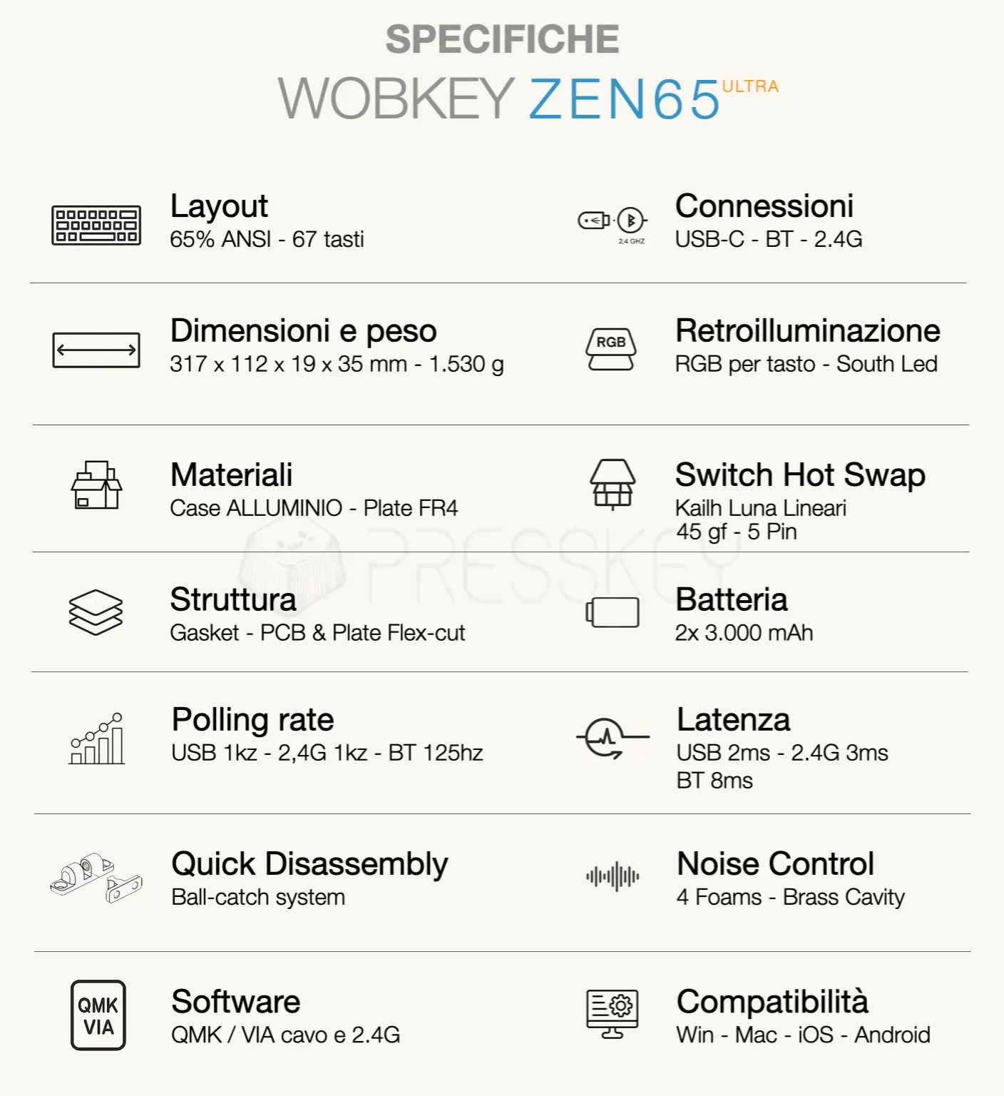 Con la nuova Zen65 Ultra, il brand propone una soluzione nel layout 65%, compatta e ben bilanciata, capace di adattarsi tanto alle scrivanie minimal quanto a chi cerca una build portatile e completa. Non è certo un formato nuovo, ma Wobkey sembra aver trovato il giusto equilibrio tra cura del design, qualità costruttiva e feature da custom, mantenendo al tempo stesso prezzi competitivi.