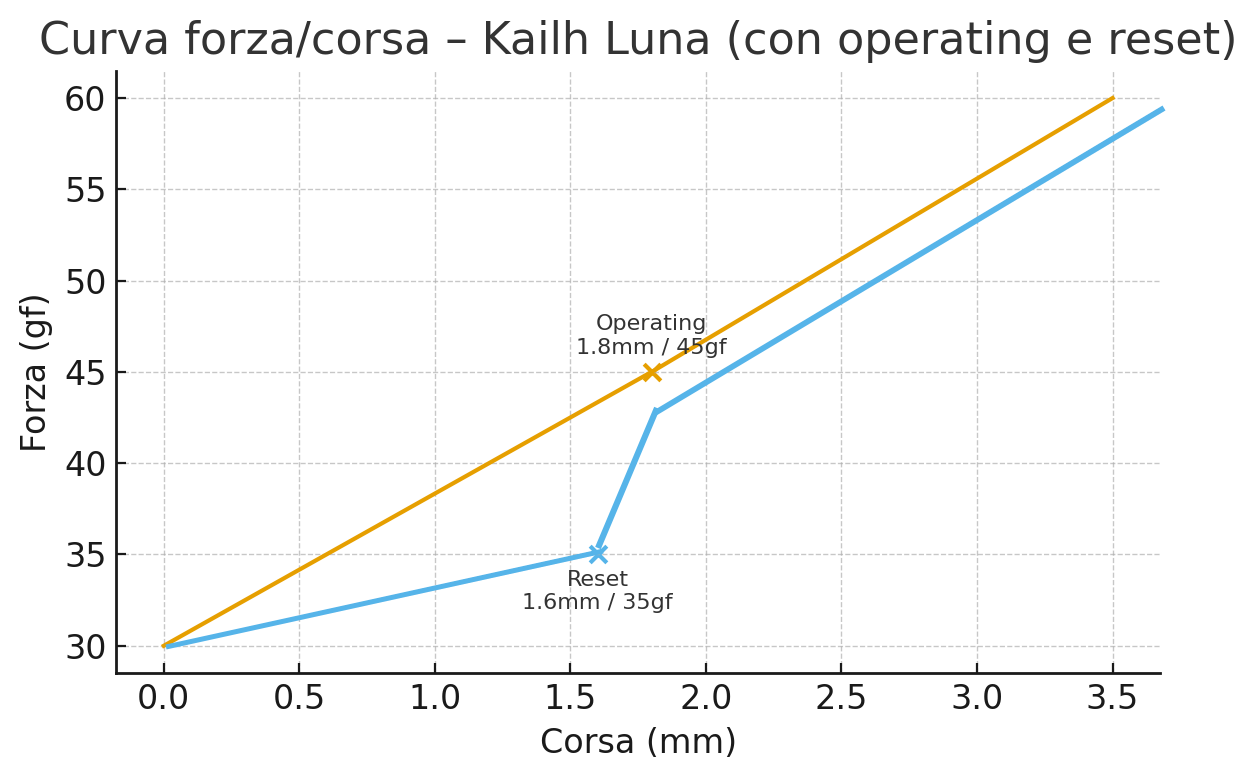 I Luna sono lineari da 45g, molto scorrevoli sotto le dita e con un suono pieno e controllato, cosa che si percepisce immediatamente anche dal sound test. Sono già lubrificati di fabbrica in modo uniforme, e questo li rende pronti all’uso senza richiedere interventi o ottimizzazioni aggiuntive.
