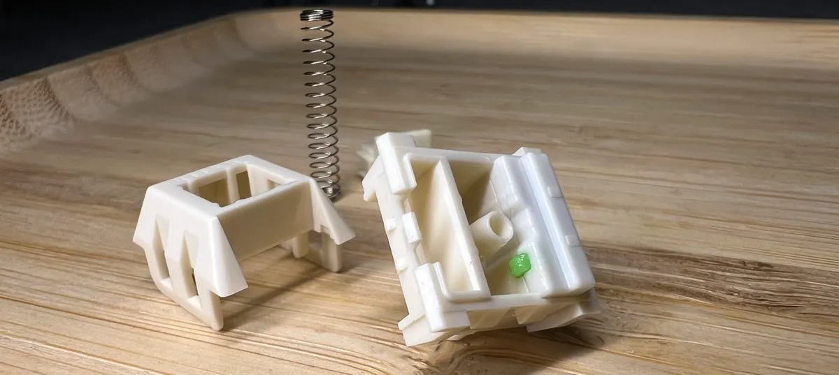 La struttura interna è particolarmente interessante: l’housing superiore e inferiore in POM garantisce stabilità e una buona risposta acustica, mentre lo stem in POK — un polimero ad alte prestazioni introdotto come evoluzione del POM — offre maggiore resistenza all’usura, meno attrito e una sensazione più pulita durante la corsa. La molla da 19mm a singolo stadio completa il pacchetto, contribuendo a una corsa lineare prevedibile e piacevole.