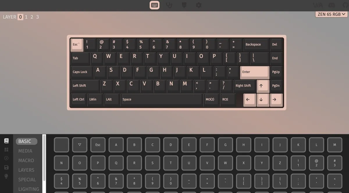 La Wobkey Zen65 supporta la personalizzazione tramite VIA, permettendo di rimappare i tasti, creare macro e gestire i layer con la consueta interfaccia semplice e pulita. Non è previsto un software proprietario, e per molti questa è un’ottima notizia: VIA è leggero, intuitivo e funziona alla stessa maniera su tutte le tastiere compatibili.