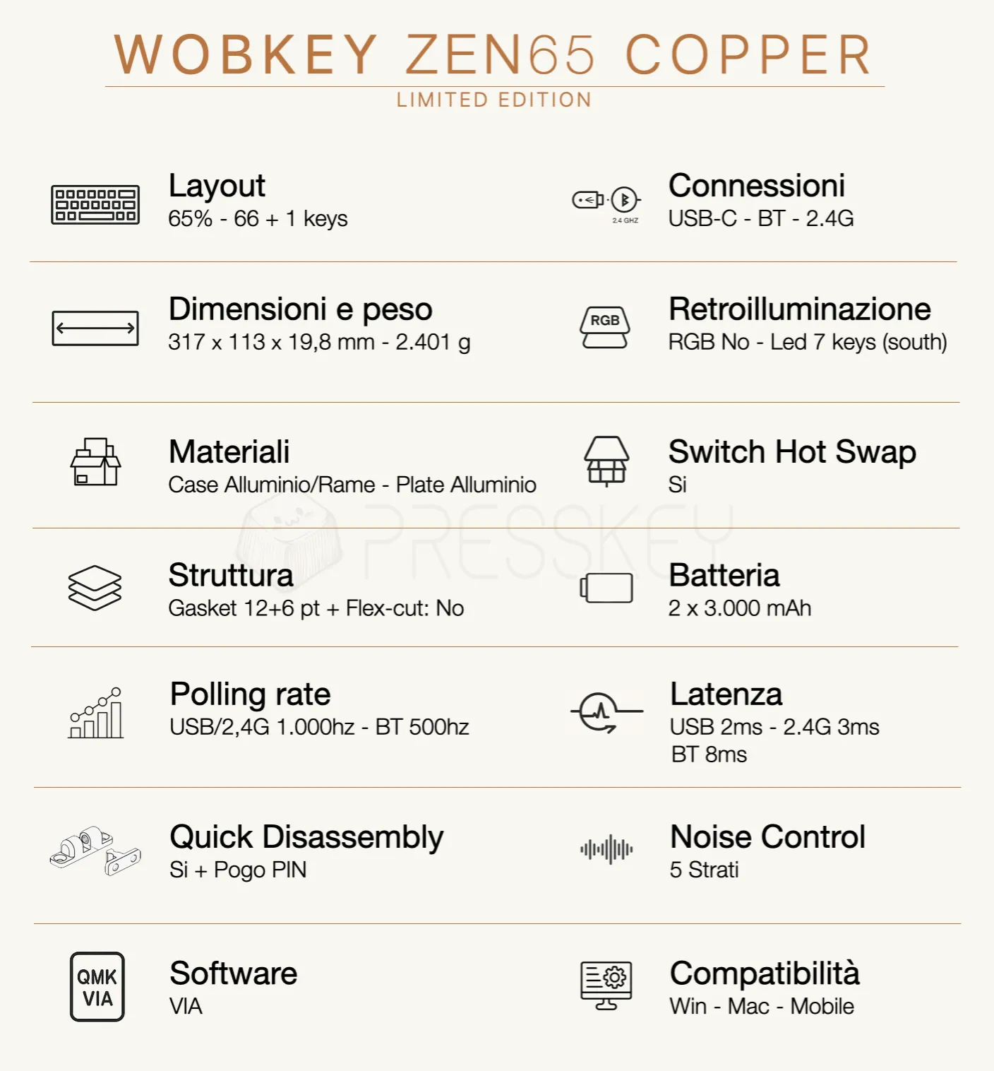 Per avere una visione chiara e immediata delle caratteristiche della Zen 65 Copper, ho raccolto tutte le specifiche tecniche in un’infografica, così da renderle più semplici da consultare e leggere a colpo d’occhio.
