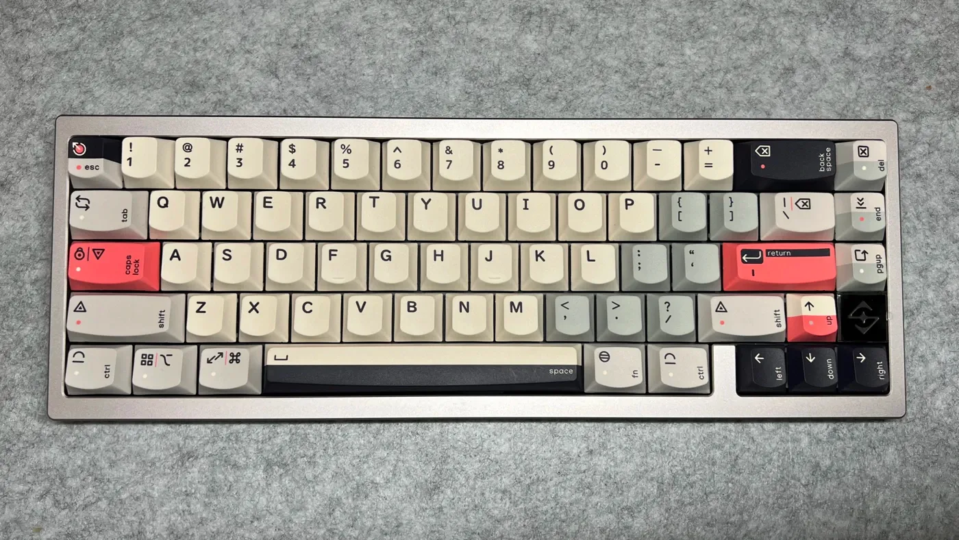 Per questa configurazione ho scelto i keycap Turn to 90’s di Keytok, un set ispirato all’estetica degli anni ’90, caratterizzato da un uso deciso di blocchi di colore e linee nette, con alcuni elementi grafici ruotati di 90° a richiamare proprio quel tipo di linguaggio visivo. Al di là dell’aspetto estetico, si tratta di keycap basati su profilo Cherry con alcune modifiche ergonomiche mirate: bordi inferiori più arrotondati, superfici leggermente riviste per migliorare il contatto con le dita e una costruzione interna pensata per restituire un suono più compatto.
