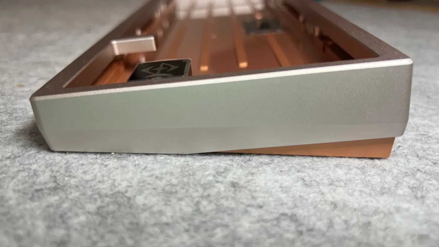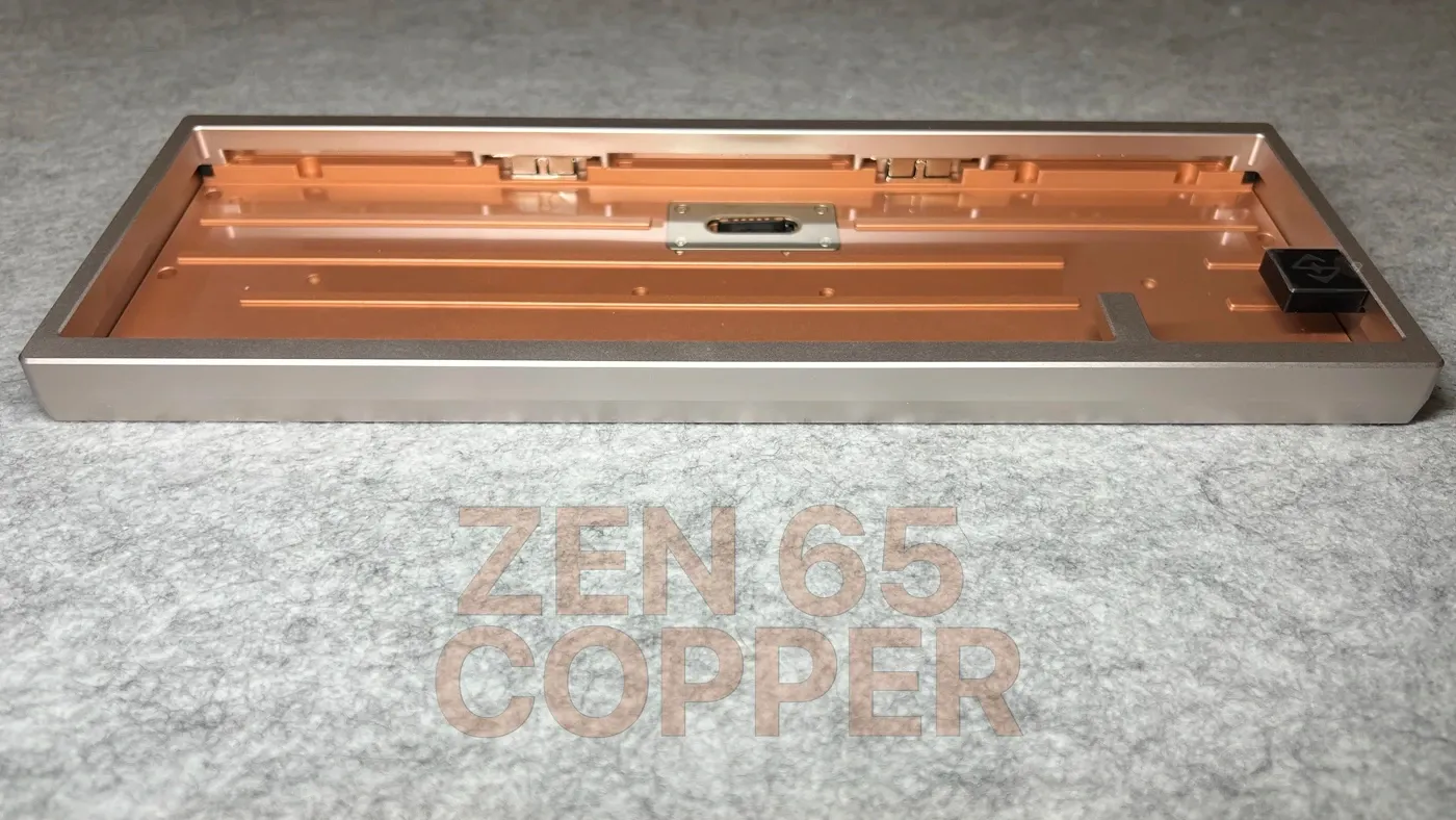 La Zen 65 Copper costruisce gran parte della propria identità attorno ai materiali, come elemento strutturale in grado di influenzare in modo diretto percezione al tatto e comportamento acustico. Il cuore del progetto è rappresentato dalla base in rame, ricavata — come indicato dall’azienda — a partire da un blocco pieno da circa 4 kg e lavorata tramite CNC fino a raggiungere un peso finale di 1,7 kg. Una scelta che incide direttamente sulla resa strutturale e acustica della tastiera. La struttura ibrida infatti, con top in alluminio 6063 e bottom in rame ad alta densità, contribuisce nella gestione delle vibrazioni, aspetto che gioca un ruolo fondamentale nel carattere complessivo di questa Zen.