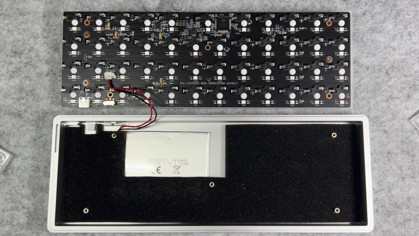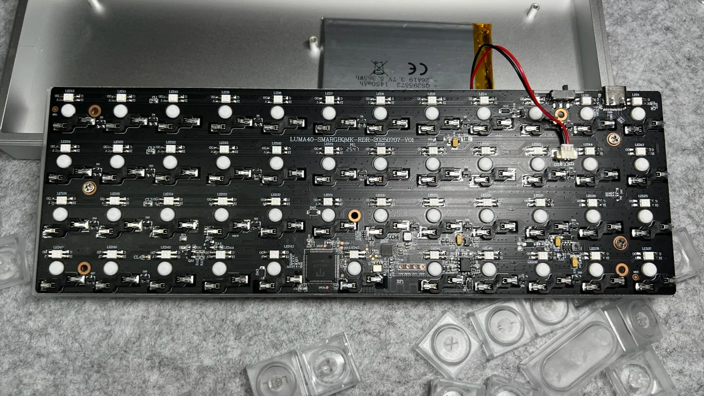 Aprendo la Epomaker Luma40 si capisce abbastanza in fretta che Epomaker, almeno su questo modello, ha scelto una struttura piuttosto semplice e diretta, senza inseguire soluzioni “di moda” (gasket?!?) solo per poterle mettere in scheda tecnica. Il teardown che ho realizzato mostra infatti una costruzione con PCB e plate privi di flex cut, scelta che restituisce subito l’idea di una tastiera pensata più per mantenere una risposta compatta.