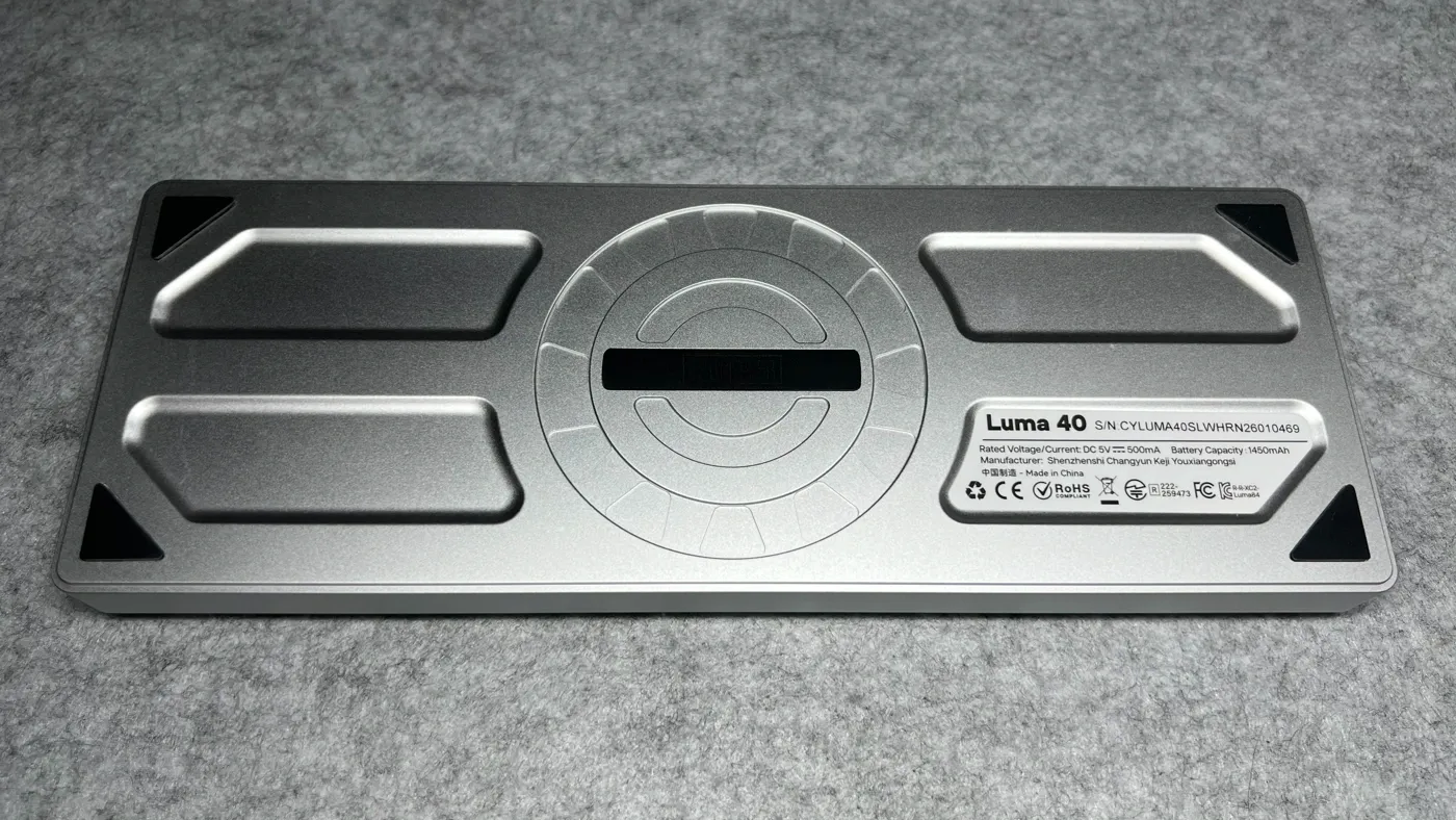 Il case è realizzato in alluminio lavorato CNC, con una finitura liscia che restituisce una buona sensazione di solidità e che nel complesso contribuisce a dare alla tastiera un aspetto pulito. Particolari anche i keycaps realizzati con finitura bianca smerigliata e semitrasparente che le dà un look piuttosto riconoscibile, soprattutto quando la si osserva da vicino. Sul retro trova posto anche un piccolo badge in metallo inciso, che aggiunge un dettaglio estetico in più senza risultare fuori contesto. Nel complesso, la Luma40 mi è sembrata una tastiera curata, con un design minimale e con materiali che trasmettono una sensazione generale di buona qualità.