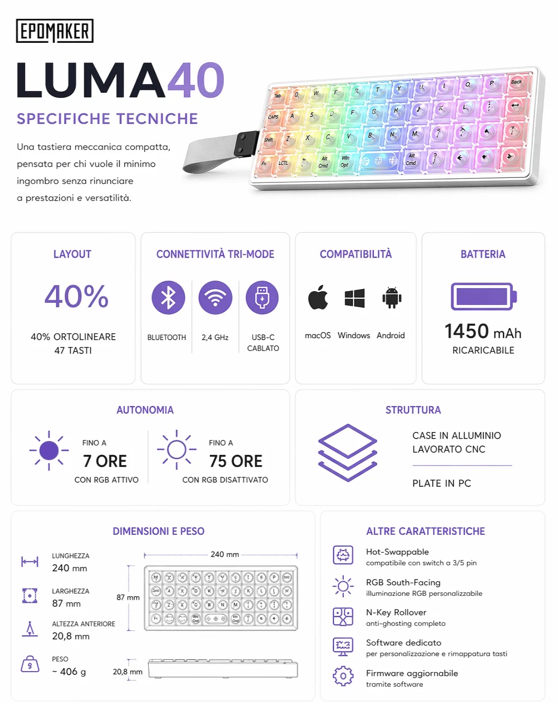 Per rendere più immediata la lettura della scheda tecnica, ho raccolto qui sotto le specifiche principali della Luma40 in una pratica infografica riassuntiva.