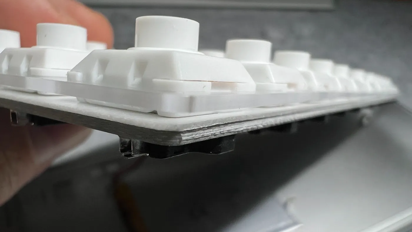 Dal punto di vista degli strati, quello che ho trovato è una configurazione abbastanza essenziale ma sensata: sopra troviamo il plate in PC, sotto al quale è presente un sottile strato di foam bianco inserito tra plate e PCB, mentre nella parte inferiore della tastiera trova posto uno strato nero spugnoso, appoggiato sul fondo del case, con il compito evidente di smorzare almeno in parte le risonanze interne. Non c’è invece alcuna traccia di gasket, ma in questo caso non lo considero un’assenza da sottolineare in negativo, semplicemente perché la Luma40 non nasce come tastiera gasket e, una volta aperta, questa cosa diventa subito molto chiara anche nel modo in cui è organizzata internamente. L’interno della Luma40 non racconta una tastiera differente e punta a restare semplice, compatta e abbastanza minimale nella risposta.